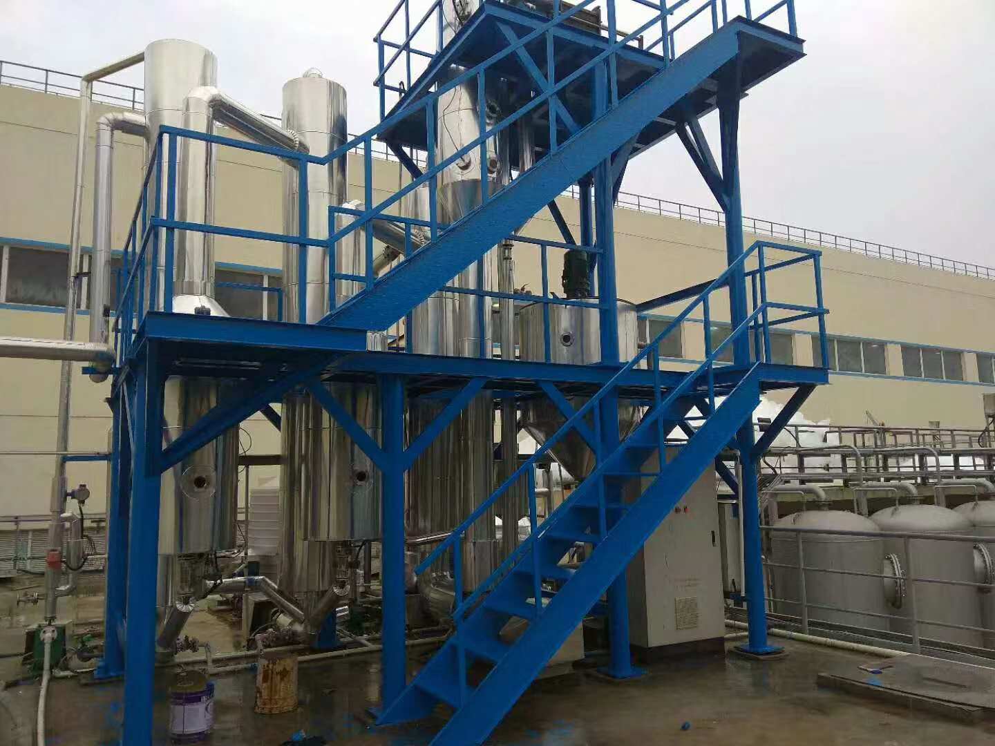 三效蒸发器组成及原理 三效蒸发器主要由相互串联的三组蒸发器、冷凝 器、盐分离器和辅助设备等组成三组蒸发器以串联的形式运行,组成三效蒸发器。 整套蒸发系统采用连续进料连续出料的生产方式。 高含盐废水首先进入一效强制循环结晶蒸发器,结晶蒸发器配有循环泵,将废水打入蒸发换热室,在蒸发换热室内,外接蒸气液化产生汽化潜热,对废水进行加热。由于蒸发换热室内压力较大,废水在蒸发换热室中在高于 正常液体沸点压力下加热至过热。加热后的液体进入结晶蒸发室后,废水的压力迅速下降导致部分废水闪蒸, 或迅速沸腾。废水蒸发后的蒸气进入二效强制循环蒸发 器作为动力蒸气对二效蒸发器进行加热,未蒸发废水和盐分暂存在结晶蒸发室。一效、二效、三效强制循环蒸 发器之间通过平衡管相通,在负压的作用下,高含盐废 水由一效向二效、三效依次流动,废水不断地被蒸发, 废水中盐的浓度越来越高,当废水中的盐分超过饱和状态时,水中盐分就会不断地析出,进入蒸发结晶室的下 部的集盐室。吸盐泵不断将含盐的废水送至旋涡盐分离 器,在旋涡盐分离器内,固态的盐被分离进入储盐池, 分离后的废水进入二效强制循环蒸发器加热,整个过程 周而复始,实现水与盐的最终分离。 冷凝器连接有真空系统,真空系统抽掉蒸发系统内产生的未冷凝气体,使冷凝器和蒸发器保持负压状态, 提高蒸发系统的蒸发效率。在负压的作用下,三效强制 循环蒸发器中的废水产生的二次蒸气自动进入冷凝器, 在循环冷却水的冷却下,废水产生的二次蒸气迅速转变成冷凝水。冷凝水可采用连续出水的方式,回收至回用水池。