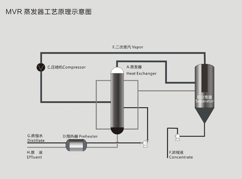 机械式蒸汽再压缩( MVR )蒸发器,其原理是利用高能效蒸汽压缩机压缩蒸发产生的二次蒸汽,把电能转换成热能,提高二次蒸汽的焓,被提高热能的二次蒸汽打入蒸发室进行加热,以达到循环利用二次蒸汽已有的热能,从而可以不需要外部鲜蒸汽,通过蒸发器自循环来实现蒸发浓缩的目的。通过PLC、工业计算机( FA),组态等形式来控制系统温度、压力、马达转速,保持系统蒸发平衡。从理论上来看,使用MVR蒸发器比传蒸发器节省80%以上的能源,节省90%以上的冷凝水,减少50%以上的占地面积。